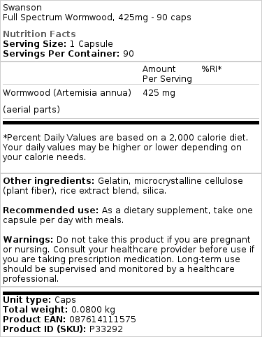 Également connue sous le nom d’Annie douce, d’absinthe chinoise ou d’absinthe douce, l’Artemisia annua est une herbe ancestrale largement utilisée par les herboristes traditionnels chinois. Les capsules d’absinthe Swanson contiennent de la poudre d’artemisia 100% pure et à spectre complet.