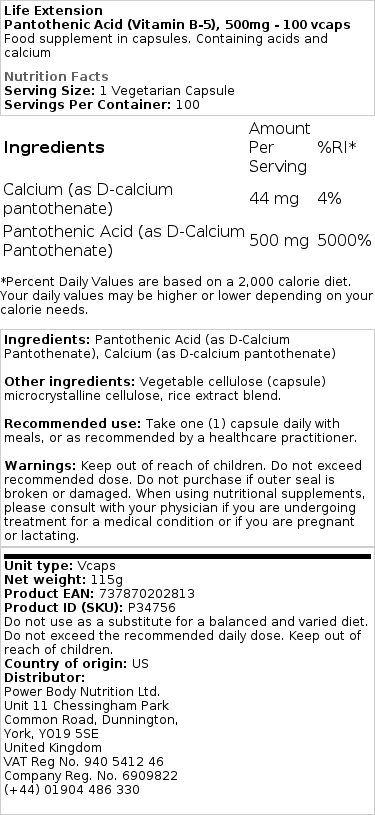 Acide pantothénique (en tant que pantothénate de D-calcium) 500mg 10000%