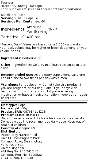 La berbérine est un alcaloïde naturel présent dans une grande variété d’herbes traditionnelles, notamment l’hydraste du Canada, l’épine-vinette et le raisin d’Oregon. De nombreux herboristes attribuent à cet alcaloïde unique les bienfaits des anciens toniques à base de plantes utilisés par les populations autochtones du monde entier. Swanson Premium Brand Berberine fournit une quantité garantie de 400 mg de Berberine HCl pure, naturellement dérivée de l’épine-vinette indienne ou du curcuma arborescent.