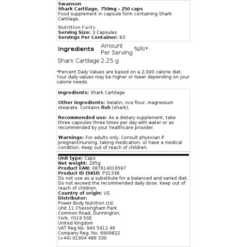 Swanson propose désormais du cartilage de requin sous forme de supplément pratique. Pour aider à maintenir vos articulations dans un état optimal, les pilules de cartilage de requin Swanson bénéficient d’un soutien global à la santé des articulations ! Cette formule fournit des aliments pour le soin des articulations à l’aide d’une structure biologique similaire à celle du cartilage qui rembourre les articulations. Chaque portion fournit un puissant 750 mg de cartilage de requin pur pour l’entretien quotidien des articulations.