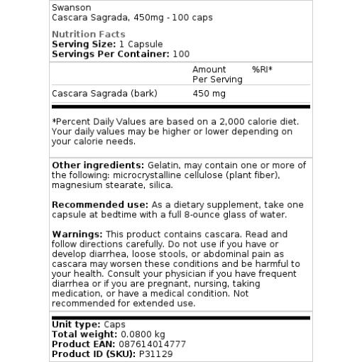 La prochaine fois que vous vous sentirez coincé, remettez-vous sur la bonne voie avec Swanson Cascara Sagrada ! L’écorce de cet arbre de la côte Pacifique contient des composés uniques qui agissent doucement mais efficacement pour favoriser des selles régulières. Chaque capsule délivre 450 mg d’écorce pure de cascara sagrada.