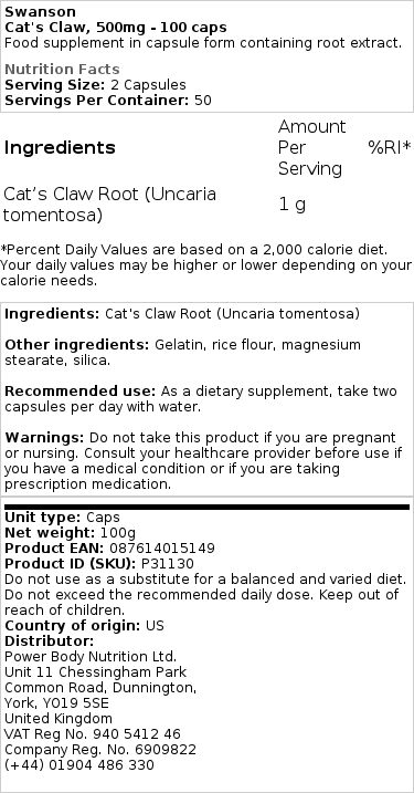 Swanson Cat’s Claw est une formule antioxydante à base de plantes qui provient des forêts tropicales du Pérou. Ce produit comporte des composés alcaloïdes qui favorisent le soutien nutritionnel d’un système immunitaire sain. Chaque capsule délivre 500 mg de racine pure de griffe de chat.