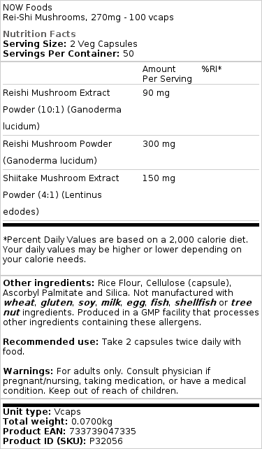 NOW Rei-Shi Mushrooms est un mélange de champignons Reishi (également connu sous le nom de Ling Zhi) et Shiitake. Le Reishi et le Shiitake sont tous deux bien connus dans l’herboristerie orientale et sont utilisés pour promouvoir la santé et le bien-être depuis des siècles. Ces dernières années, les chercheurs ont identifié des polysaccharides bioactifs clés qui pourraient contribuer aux propriétés de soutien de la santé de ces deux super champignons.