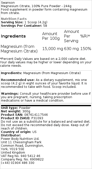La poudre de citrate de magnésium Swanson Premium facilite la supplémentation en magnésium : une seule mesure suffit. Comme de plus en plus de professionnels de la santé recommandent les suppléments de minéraux sous forme de citrate, nous avons reçu de nombreuses demandes pour plus d’options. Si vous recherchez une poudre de citrate de magnésium de haute qualité, la voici. Cette nouvelle poudre vous permet de personnaliser facilement votre dosage et vous offre une alternative si vous avez du mal à avaler de grosses pilules.