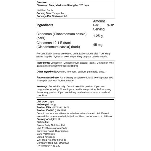 Swanson Maximum-Strength Cinnamon Bark fournit un soutien exceptionnel de la glycémie ! Notre corps compte sur un équilibre entre le glucose et l’insuline dans la circulation sanguine pour s’assurer que les cellules obtiennent l’énergie dont elles ont besoin pour accomplir leurs fonctions biologiques de base. Les flavonoïdes de la cannelle aident l’insuline à travailler plus efficacement pour maintenir cet équilibre délicat. Chaque portion de notre écorce de cannelle fournit un puissant 1,25 g de cannelle par portion plus un extrait de cannelle 10:1 qui aide à maintenir l’équilibre métabolique et à soutenir la santé de la glycémie.