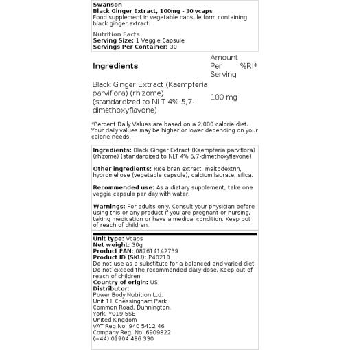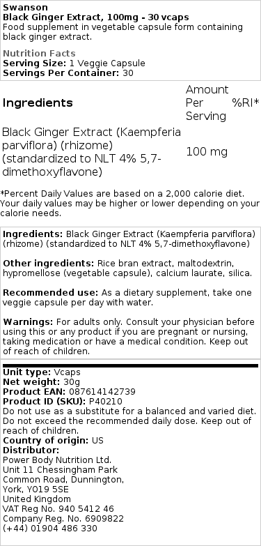 L’extrait de gingembre noir Swanson présente un extrait de Kaempferia paviflora standardisé de première qualité avec une concentration garantie de 4% 5,7-diméthoxyflavone. Certaines recherches sur ces composés sembleraient soutenir théoriquement l’utilisation traditionnelle du gingembre noir pour la santé sexuelle et la vigueur physique dans la mesure où ils semblent apporter un certain soutien à la santé circulatoire et à l’intégrité des tissus. Dans le cœur et le système circulatoire, on a constaté que les constituants du gingembre noir exercent de légères propriétés relaxantes sur le tissu musculaire et l’endothélium (la paroi interne de vos vaisseaux sanguins) tout en protégeant l’endothélium du stress oxydatif en agissant comme antioxydants. Ces actions ont des ramifications positives sur l’ensemble du système cardiovasculaire. Les méthoxyflavones spécifiques du gingembre noir ont démontré des propriétés cholinergiques, ce qui signifie qu’elles soutiennent les niveaux de choline et d’acétylcholine dans le cerveau pour favoriser le bien-être mental et émotionnel.