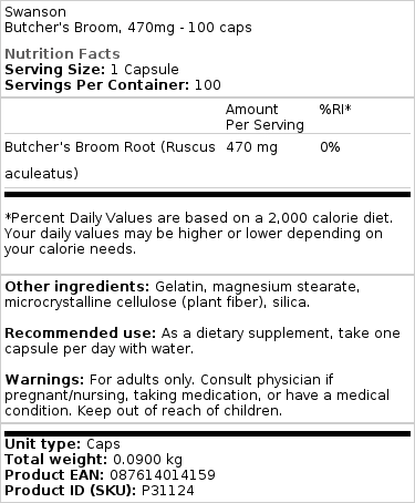 Mettez du peps dans votre démarche et gardez vos jambes au meilleur de leur forme grâce à la puissance des plantes du balai de boucher Swanson ! La racine de cette plante européenne contient des acides gras, des stérols et des composés phénoliques qui aident à promouvoir une circulation saine, en particulier dans les jambes et les extrémités inférieures. Nos capsules de balai de boucher contiennent 470 mg de racine pure et séchée.