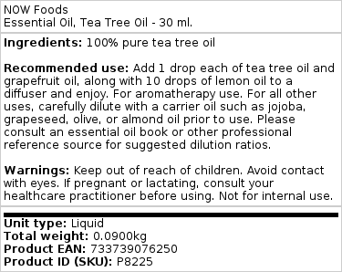 Offrez-vous les bienfaits de l’huile essentielle de Tea Tree avec cette bouteille de 30 ml de NOW Foods. Qualité contrôlée et certifiée, elle sera un allié précieux pour votre bien-être au quotidien.