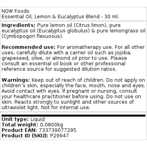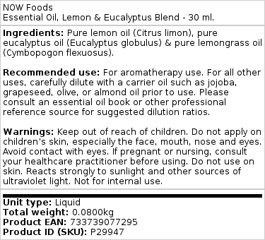 Ingrédients : Huile de citron pure (Citrus limon), huile d’eucalyptus pure (Eucalyptus globulus) & huile de citronnelle pure (Cymbopogon flexuosus).