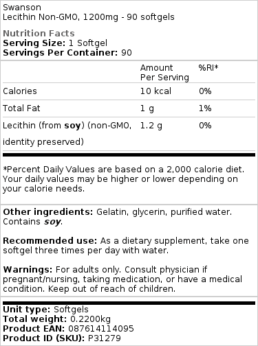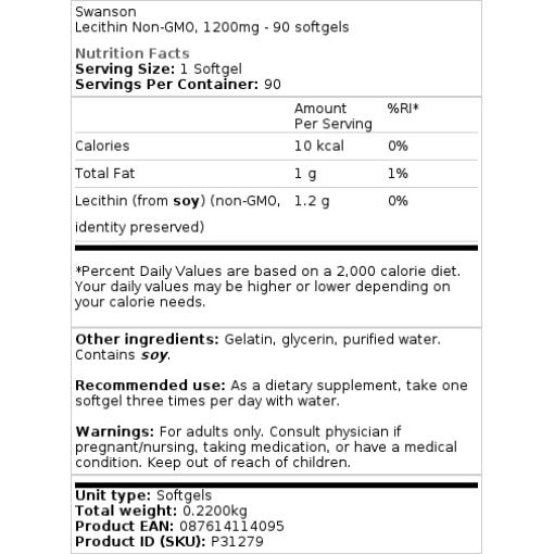 Pour un maintien cardiovasculaire sain et des niveaux de cholestérol déjà dans la plage normale, essayez la lécithine de Swanson Health Products ! Ce supplément unique est un émulsifiant de graisse exceptionnel qui contient de la phosphatidylcholine pour aider à soutenir les fonctions du cerveau et du foie. Chaque softgel à haute absorption fournit 1 200 mg de lécithine de soja.