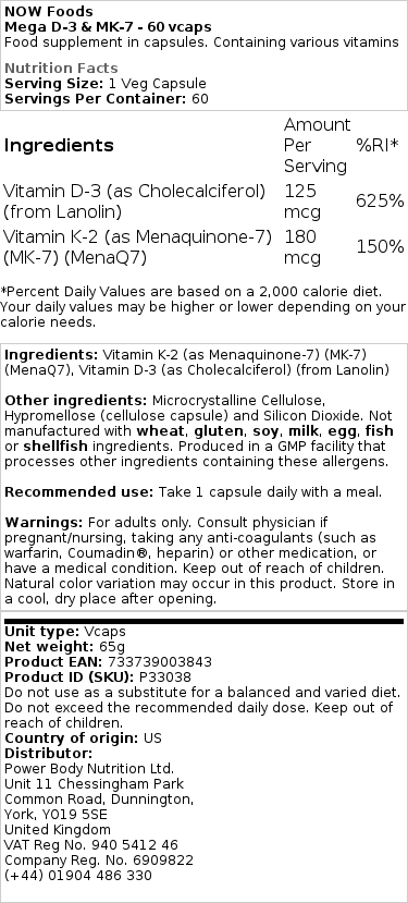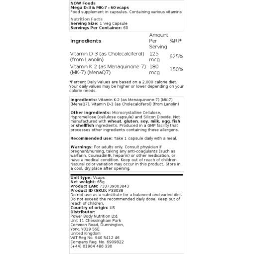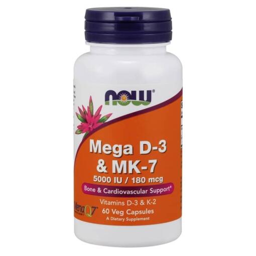 NOW Mega D-3 & MK-7 combine les vitamines D-3 et K-2, deux nutriments ayant fait l’objet de recherches approfondies pour leur rôle dans la santé des os, des dents et du système cardiovasculaire. La vitamine D-3 travaille avec le calcium pour soutenir la santé des os, et des études plus récentes indiquent qu’elle est également importante pour la santé du système immunitaire. MenaQ7 MK-7 est une forme unique, sans soja et biodisponible de vitamine K-2 qui joue un rôle essentiel dans la santé artérielle grâce à sa capacité à soutenir le métabolisme correct du calcium dans les vaisseaux sanguins et les artères. La vitamine K-2 est également importante pour la formation d’os solides et sains.