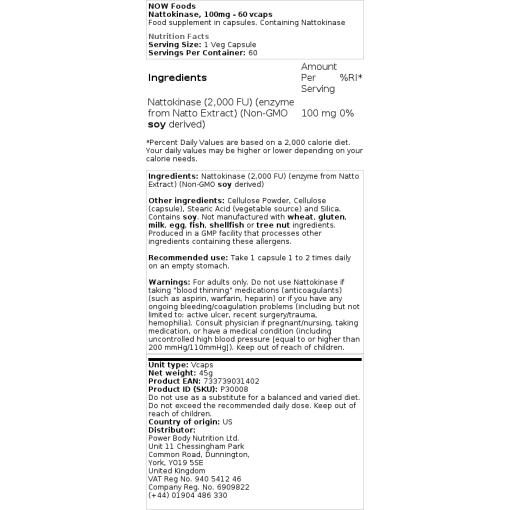 La Nattokinase est une enzyme isolée du Natto, un aliment traditionnel japonais à base de soja fermenté. Le Natto est consommé depuis des milliers d’années pour ses nombreuses propriétés favorables à la santé. Plus récemment, des études cliniques et non cliniques ont démontré que la Nattokinase peut aider à promouvoir la santé cardiaque et circulatoire en soutenant les fonctions normales de coagulation du sang. NOW Nattokinase est dérivé de soja non OGM et contient 2 000 FU (unités fibrinolytiques) par portion de 100 mg.