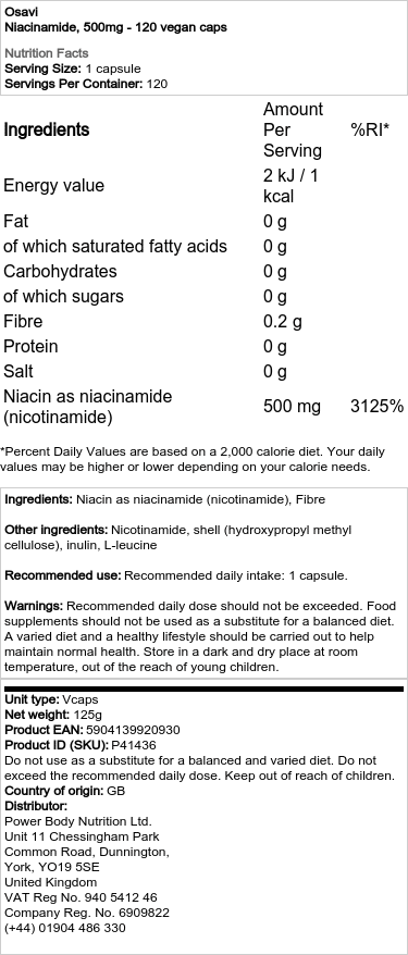 Les aliments typiques riches en vitamine B3 ou niacinamide comprennent le poisson, la dinde, l’avocat et le riz brun. Le mode de vie ou le régime alimentaire peuvent toutefois exclure ou limiter considérablement la niacinamide d’un régime. Il vaut alors la peine de recourir à une supplémentation appropriée. Notre supplément est conçu pour convenir aux végétariens et aux végétaliens, et il est facile à prendre. Une capsule par jour fournit 500 mg de niacinamide.