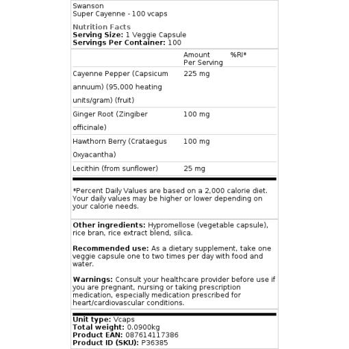 La cayenne n’est pas seulement une épice favorite dans les plats culinaires. Sous forme de supplément, Swanson Super Cayenne aide à maintenir une circulation saine dans le corps, ainsi qu’à promouvoir la santé cardiovasculaire. Cette formule spéciale contient 225 mg de cayenne avec de la racine de gingembre, de la baie d’aubépine et de la lécithine pour un soutien puissant à la santé cardiaque.