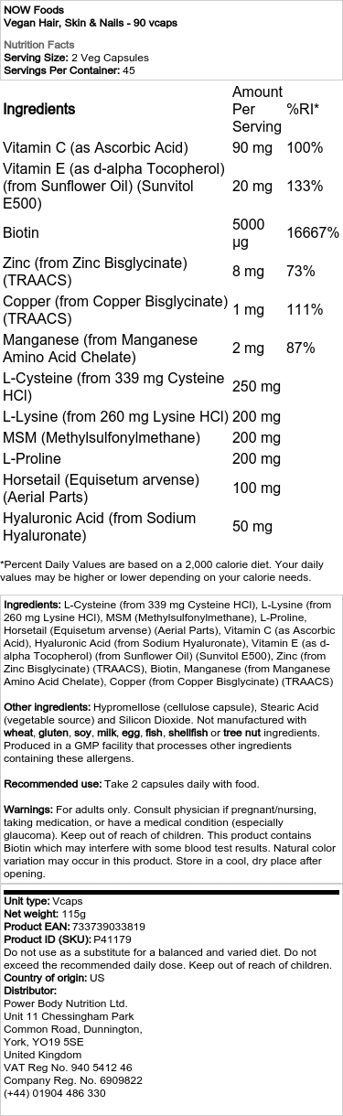 NOW Solutions Vegan Hair, Skin & Nails agit au niveau cellulaire pour favoriser la beauté naturelle de l’intérieur. Cette formule entièrement végétalienne offre les acides aminés et les minéraux qui sont essentiels à la production de collagène et de kératine, qui sont les principaux composants structurels des cheveux, de la peau et des ongles. Cette formule contient également les vitamines antioxydantes C et E, qui aident à protéger la peau des radicaux libres, ainsi que de la biotine et de l’acide hyaluronique, qui peuvent également favoriser une peau saine et jeune.
