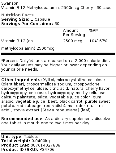Vitamine B-12 Méthylcobalamine, 2500mcg Cerise – 60 comprimés
