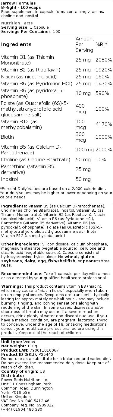Jarrow Formulas B-Right is een zorgvuldig samengesteld voedingssupplement dat een breed scala aan B-vitamines bevat. Deze capsules zijn ontworpen om deel uit te maken van uw dagelijkse routine,met een focus op kwaliteit en natuurlijke ingrediënten.