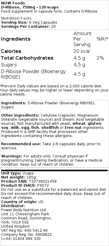 Productbeschrijving van NOW Foods – D-Ribose, 750 mg – 120 vegetarische capsules