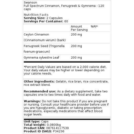 Swanson – Volledig spectrum Kaneel, Geitenhoorn en Gymnema – 120 capsules