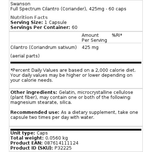 Swanson – Volledig Spectrum Koriander 425mg – 60 capsules
