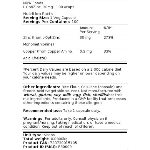Productbeschrijving van NOW Foods – L-OptiZink, 30 mg – 100 capsules