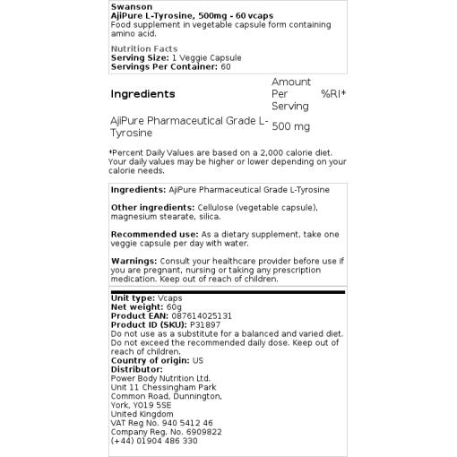Swanson – L-Tyrosine, 500 mg – 60 capsules