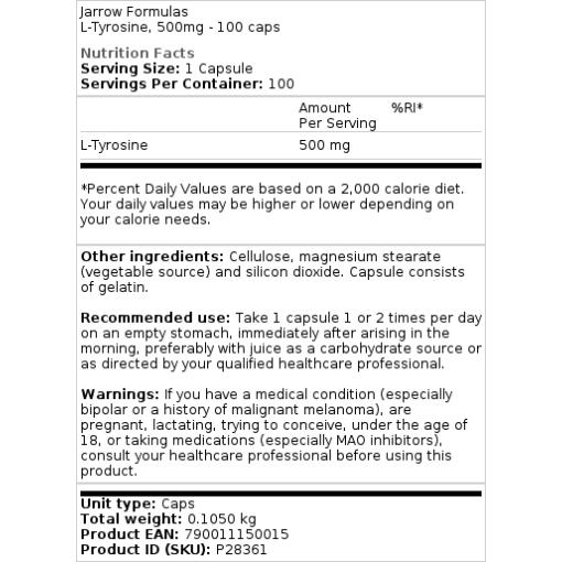 Productbeschrijving van Jarrow Formulas – L-Tyrosine, 500 mg – 100 capsules