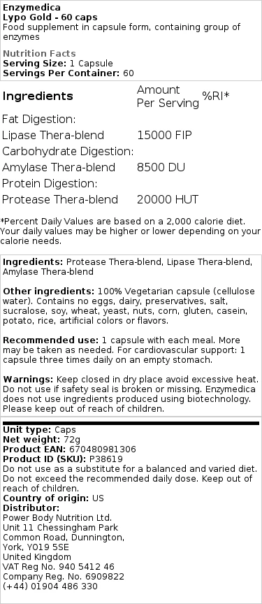 Productbeschrijving van Enzymedica – Lypo Gold – 60 capsules