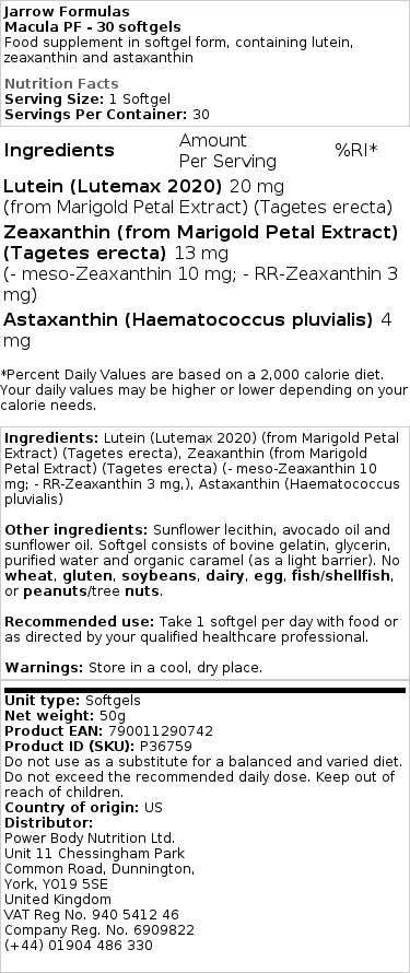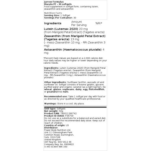 Jarrow Formulas – Macula PF – 30 softgels is een voedingssupplement dat ontworpen is om naadloos aan te sluiten bij een actieve en evenwichtige levensstijl. Deze zachte gelcapsules zijn gemakkelijk in te nemen en vormen een praktische toevoeging aan je dagelijkse routine.