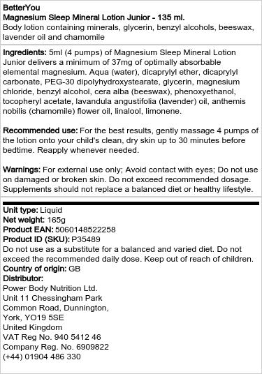 De BetterYou Magnesium Slaap Mineraal Lotion Junior is een zorgvuldig samengestelde lotion die speciaal is ontwikkeld voor kinderen. Deze lotion combineert natuurlijke ingrediënten met een kindvriendelijke geur, waardoor het een uitstekende keuze is voor dagelijks gebruik.