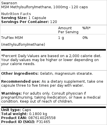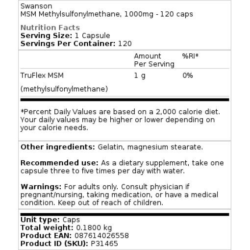 Ontdek de natuurlijke kwaliteit van SwansonS MSM (Methylsulfonylmethaan) capsules, zorgvuldig samengesteld om deel uit te maken van uw dagelijkse routine. Deze capsules bevatten 1000 mg MSM per stuk, verpakt in een handige hoeveelheid van 120 stuks per verpakking.
