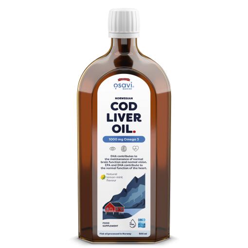 Productbeschrijving van Osavi – Noorse Kabeljauwleverolie, 1000 mg Omega 3 (Citroen-Munt) – 500 ml