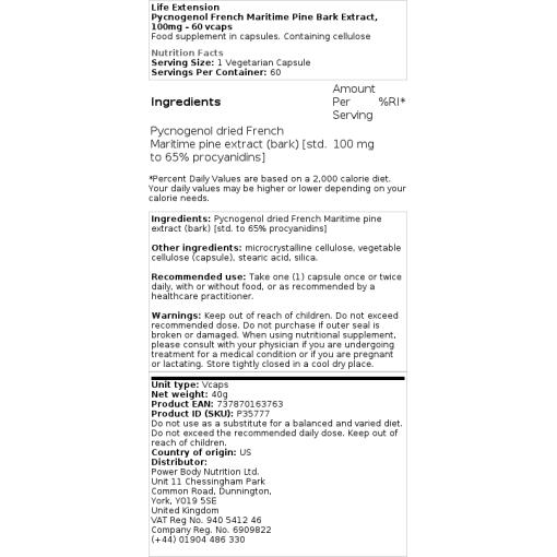Life Extension – Pycnogenol Frans Maritiem Dennenschors Extract, 100mg – 60 vegetarische capsules is een zorgvuldig samengesteld supplement dat gebruikmaakt van de natuurlijke extracten van Franse maritieme pijnboomschors. Elke capsule bevat 100 mg Pycnogenol, verpakt in een praktische vegetarische capsule.