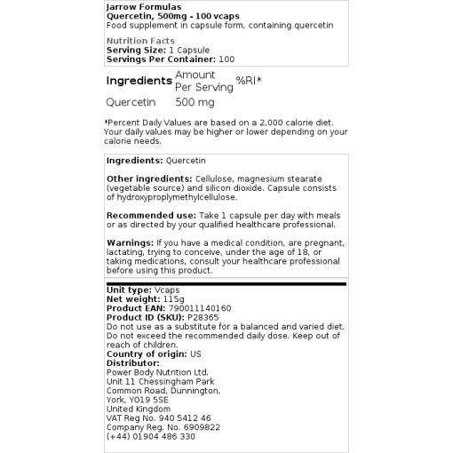 - Inhoud: Elke verpakking bevat 200 vegetarische capsules met elk 500 mg quercetine.