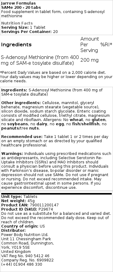 jarrow Formulas – SAMe 200 – 20 tabletten