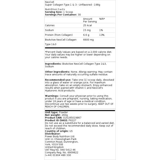 Dit supplement is vervaardigd met aandacht voor kwaliteit en zuiverheid. Het praktische formaat zorgt ervoor dat het eenvoudig toe te voegen is aan jouw dagelijkse voeding. Of je nu kiest om het door een smoothie, sap of bakrecept te mixen, NeoCell – Super Collageen biedt een handige manier om natuurlijke ingrediënten op te nemen in jouw levensstijl.