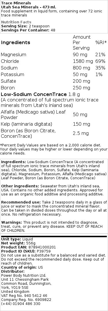 Ontdek de kracht van de natuur met onze Trace Minerals uit Utah.Dit product bevat 100% pure zee mineralen, rechtstreeks gewonnen uit het Great Salt Lake, bekend om zijn rijkdom aan natuurlijke mineralen. Zonder toevoeging van conserveermiddelen of kunstmatige ingrediënten, biedt dit supplement een zuivere en onbewerkte aanvulling op je dagelijkse voeding.