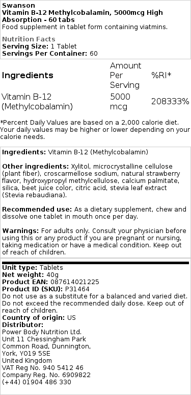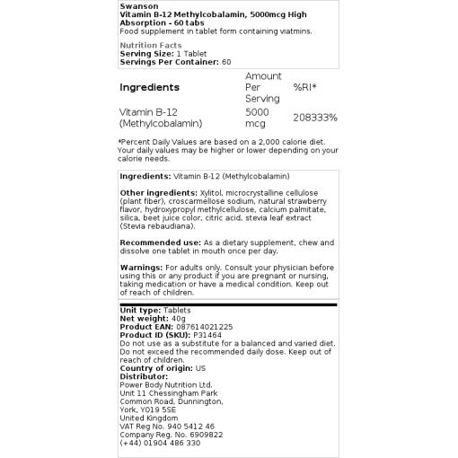 swanson – Vitamine B-12 Methylcobalamine, 5000 mcg met hoge absorptie – 60 tabletten