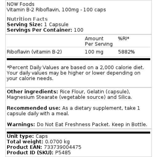 - Inhoud: Elke verpakking bevat 100 vegetarische capsules, met elk 100 mg riboflavine.